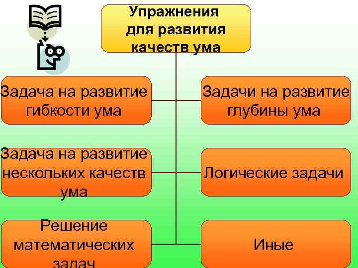 Упражнения для развития качеств ума Задача на развитие Задачи на развитие гибкости ума глубины ума Задача на развитие нескольких качеств Логические задачи ума Решение математических Иные