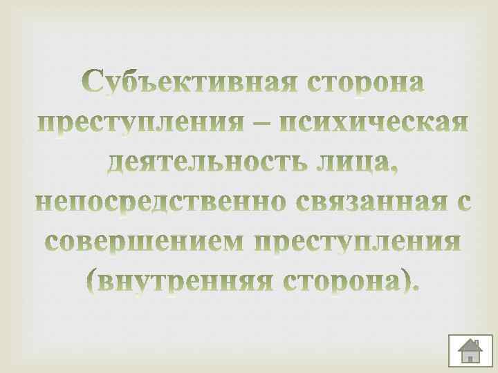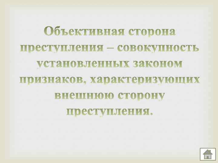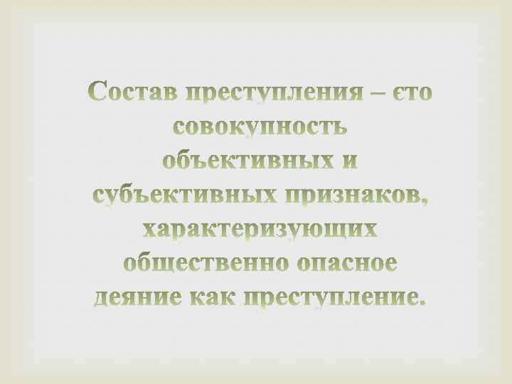 Объект преступления Факультативные признаки § Свойства основного объекта § Дополнительный § Общественные отношения (ч. 1 ст. непосредственный объект 2 УК) как взаимоотношения между людьми § Факультативный по поводу интересующих их предметов, непосредственный объект явлений материального и духовного мира § Предмет преступления § Потерпевший ОП ФП ООД ООП ПСС Время Место Способ Обстановка Орудия и средства ОП ФП Субъективная сторона Вина § § § Субъект преступления § Физическое лицо § Возраст § Вменяемость Признаки специального субъекта Мотив Цель Эмоциональное состояние Формальные Объективная сторона Обязательные признаки Материальн ые Элемент