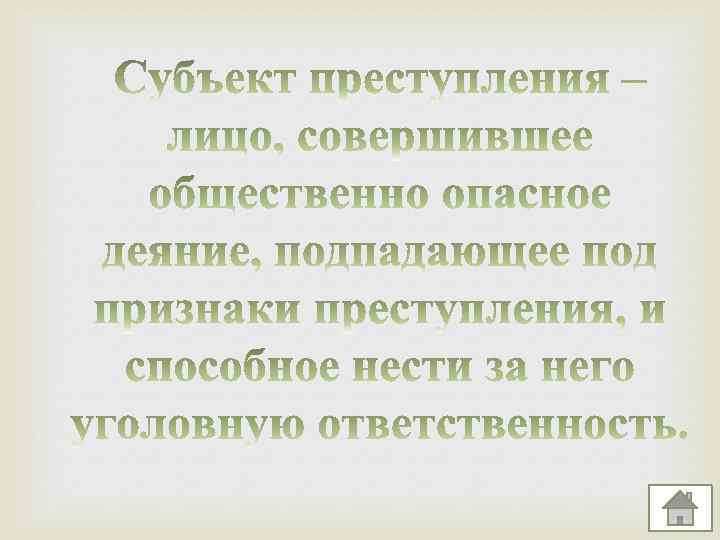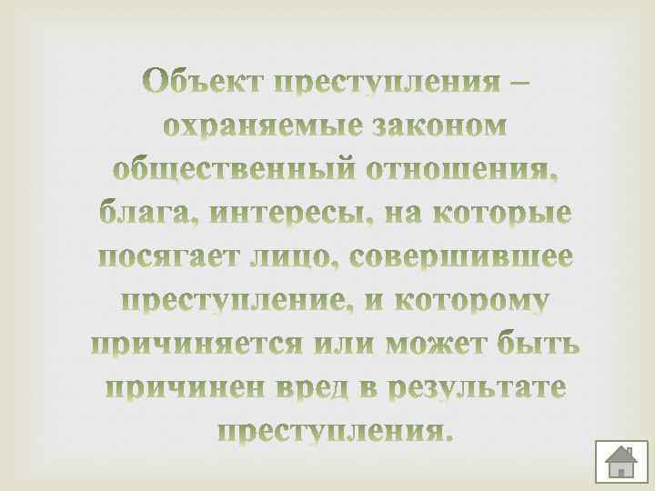 Факультативные признаки Предмет преступления овеществленный элемент материального мира, на который непосредственно воздействует виновный при преступном посягательстве. Потерпевший это физическое или юридическое лицо, которому преступлением причинен вред.