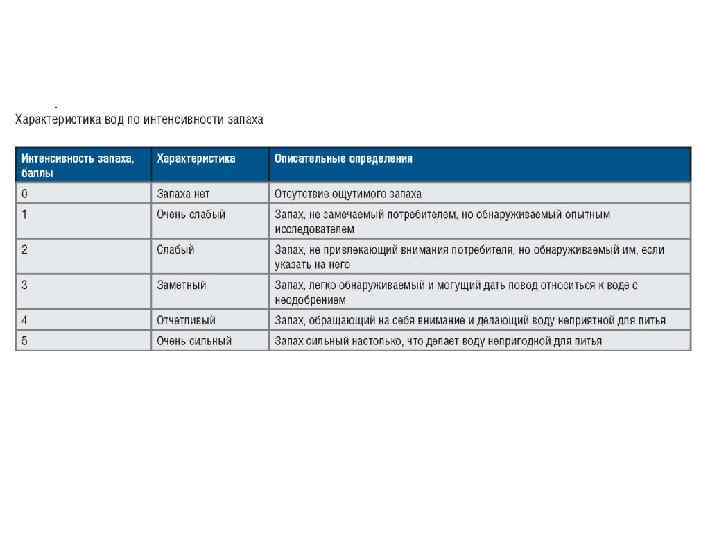 Характер и интенсивность запаха природной воды определяют органолептически. По характеру запахи делят на две группы: естественного происхождения (живущие и отмершие в воде организмы, загнивающие растительные остатки и др. ); искусственного происхождения (примеси промышленных и сельскохозяйственных сточных вод). Запахи второй группы (искусственного проис хождения) называют по определяющим запах веществам: хлорный, бензиновый и т. д.