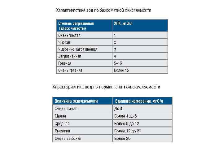 Содержание органических веществ в воде оценивается по методикам определения окисляемости воды, содержания органического углерода, биохимической потребности в кислороде, а также поглощения в ультрафиолетовой области. Величина, характеризующая содержание в воде органических и минеральных веществ, окисляемых одним из сильных химических окислителей при определенных условиях, называется окисляемостью. Существует несколько видов окисляемости воды: перманганатная, бихроматная, иодатная, цериевая (методики определения двух последних применяются редко). Окисляемость выражается в миллиграммах кислорода, эквивалентного количеству реагента, пошедшего на окисление органических веществ, содержащихся в 1 л воды.