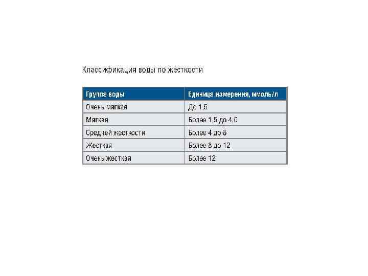 Жесткость воды обусловливается наличием в воде ионов кальция (Са 2+), магния (Mg 2+), стронция (Sr 2+), бария (Ва 2+), железа (Fe 3+), марганца (Mn 2+). Но общее содержание в природных водах ионов кальция и магния несравнимо больше содержания всех дру гих перечисленных ионов и даже их суммы. Поэтому под жесткостью понимают сумму количеств ионов кальция и магния общая жесткость, складывающаяся из значений карбонатной (временной, устраняемой кипячением) и некарбонатной (постоянной) жесткости. Первая вызвана присутствием в воде гидрокарбо натов кальция и магния, вторая наличием сульфатов, хлоридов, силикатов, нитратов и фосфатов этих металлов. Однако при значении жесткости воды более 9 ммоль/л нужно учитывать содержание в воде стронция и других щелочноземельных металлов. По стандарту ИСО 6107 1 8: 1996, включающему более 500 терминов, жесткость определяется как способность воды образовывать пену с мылом. В России жесткость воды выражают в ммоль/л. В жесткой воде обычное натриевое мыло превращается (в присутствии ионов кальция) в нерастворимое «кальциевое мыло» , образующее бесполезные хлопья. И, пока таким способом не устранится вся кальциевая жесткость воды, обра зование пены не начнется. На 1 ммоль/л жесткости воды для такого умягчения воды теоретически затрачивается 305 мг мыла, практически до 530. Но, конечно, основные неприятности от накипеобразования. Международные своды нормативов качества воды не нормируют жесткость воды только отдельно содержание в воде ионов кальция (Са 2+) и магния (Mg 2+): нормы качества питьевой воды Всемирной организации здравоохранения (ВОЗ), такие же нормы Европейского Союза (ЕС), стандарты ИСО, а также Национальные нормы питьевой воды США.
