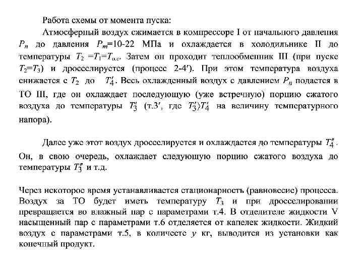 Сжатый воздух (газ) после компрессора и холодильника (в количестве 1 кг) с давлением Pm=16 -20 МПа поступает в теплообменник III СПО, где охлаждается до температуры Т 8 обратным (холодным) потоком воздуха. В т. 8 поток разделяется на две части. Часть с массой М (примерно 0, 5) направляется в детандер, а остальное количество (1 -М) проходит последовательно промежуточный IV и основной V теплообменники и дросселируется (процесс 3 -4) до конечного давления Pn. Полученная при дросселировании жидкость отделяется и выводится установки в количестве y. Поток с массой М расширяется в детандере до давления Pn с совершением работы lд, при этом он охлаждается до температуры Т 11. Затем этот воздух подмешивается к обратному потоку в т. 12, чем увеличивает охлаждающие способности последнего. Кроме того, уменьшается масса прямого потока сжатого воздуха в ТО IV и V, что позволяет охладить его до более низкой температуры чем в установке Линде. Это увеличивает производительность и повышает эффективность установки.