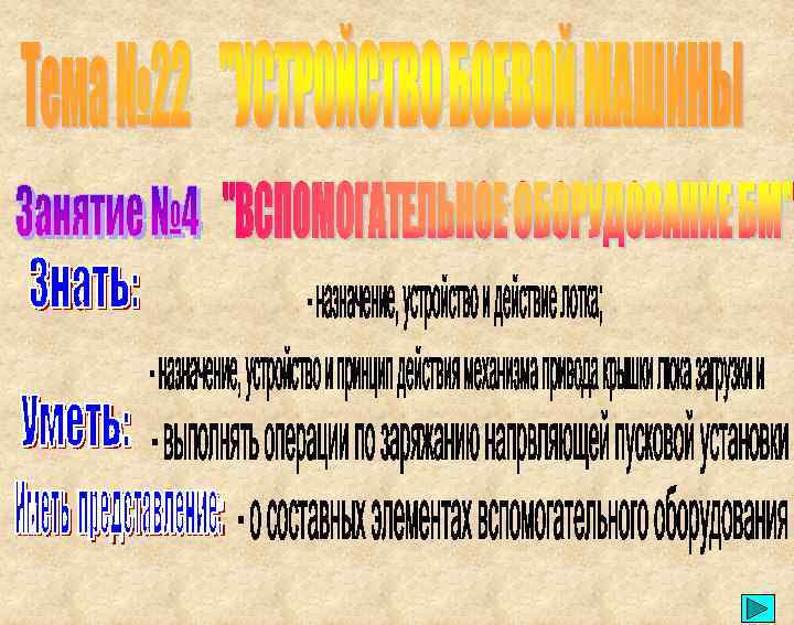 СОСТАВ ВСПОМОГАТЕЛЬНОГО ОБОРУДОВАНИЯ БОЕВОЙ МАШИНЫ 9 П 148: • четыре стеллажа для закрепления боевого комплекта ПТУР 9 М 113 и 9 М 111; • пять лотков для закрепления боевого комплекта ПТУР 9 М 113; • креномер – для определения крена БМ 9 П 148 на огневой позиции; • механизм привода крышки и козырька люка загрузки; • механизм привода крышек жалюзи воздухопритока и воздухоотвода; • блок встроенного контроля – для проверки исправности цепей пуска и блокировок цепей пуска, а также проверки параметров НАУ 9 С 451 М 1 при ТО№ 1; • радиооборудование (радиостанция Р-123 М и переговорное устройство Р-124); • приборы радиационной и химической разведки (ИМД-21 Б, ВПХР, ДК-4 КБ); • фильтро-вентиляционная установка; • прибор для ночного вождения машины (ТВНО-2 Б).
