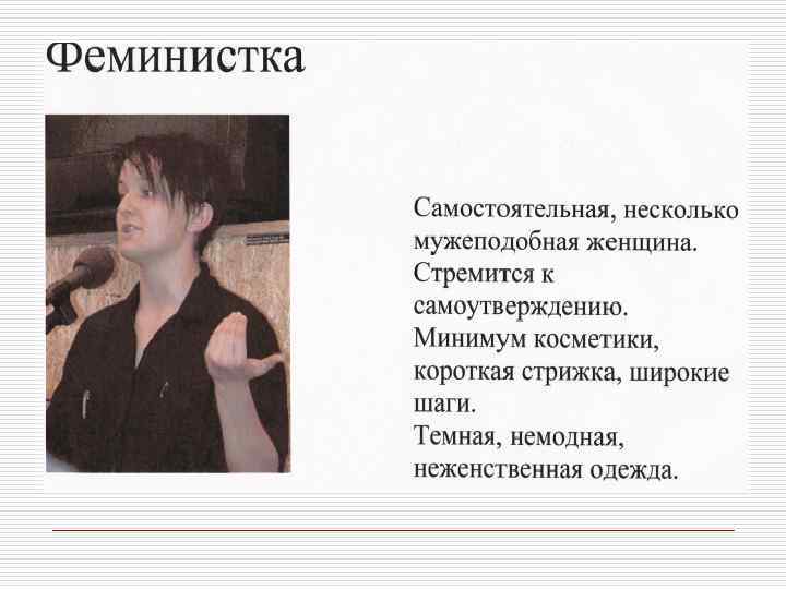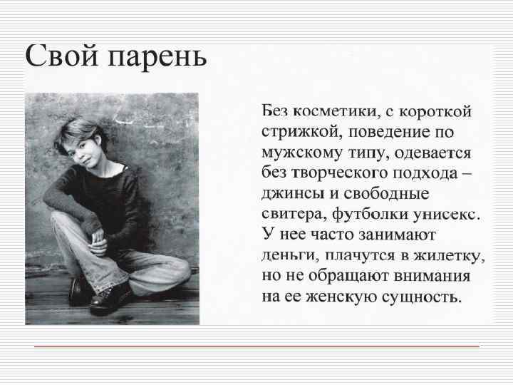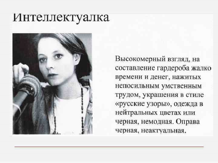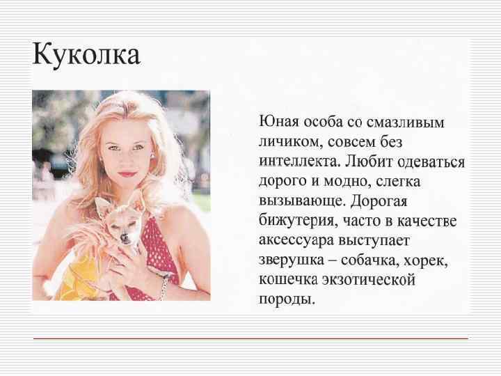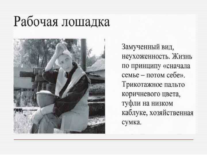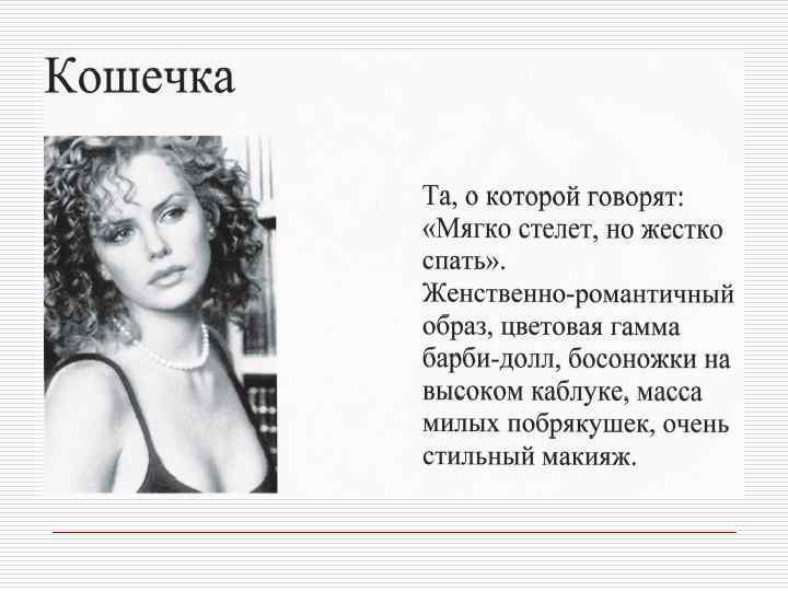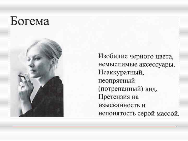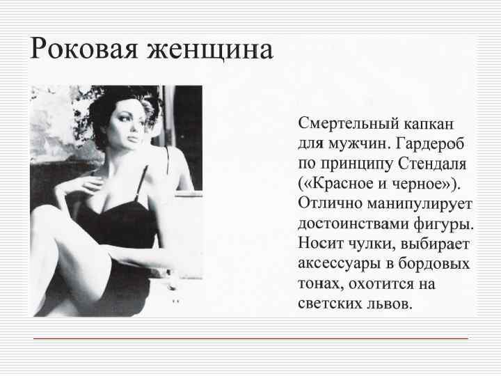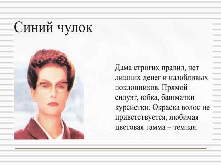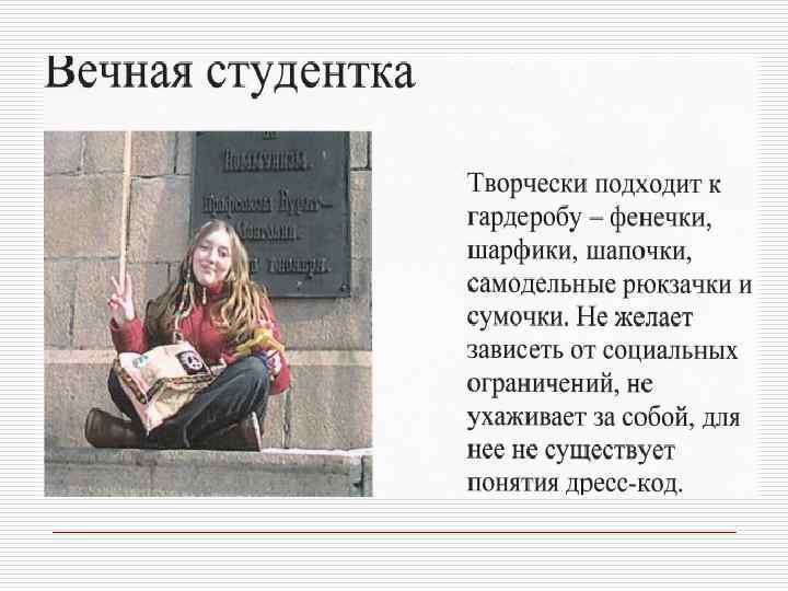 Профессия и внешний облик Профессиональная позиция o o Юрист, банкир, финансист, руководитель крупной корпорации Адвокат, o педагог, риэлтер, представитель сферы, связанной с общением o Писатель, художник, дизайнер, представитель модного или шоу- бизнеса Качества, которые необходимо демонстрировать Авторитетность, компетентность, консерватизм Признаки внешнего вида Коммуникабельность, дружелюбие, доверительность o Творчество, , индивидуальность артистический подход o o Традиционная деловая классическая одежда высокого качества базовых цветов Более демократичный стиль. Наряду с классической используется и повседневная одежда Модная одежда. Могут использоваться необычные цвета и уникальные аксессуары