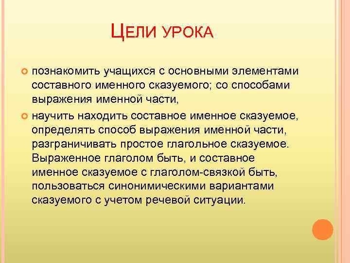 ЦЕЛИ УРОКА познакомить учащихся с основными элементами составного именного сказуемого; со способами выражения именной части, научить находить составное именное сказуемое, определять способ выражения именной части, разграничивать простое глагольное сказуемое. Выраженное глаголом быть, и составное именное сказуемое с глаголом-связкой быть, пользоваться синонимическими вариантами сказуемого с учетом речевой ситуации.