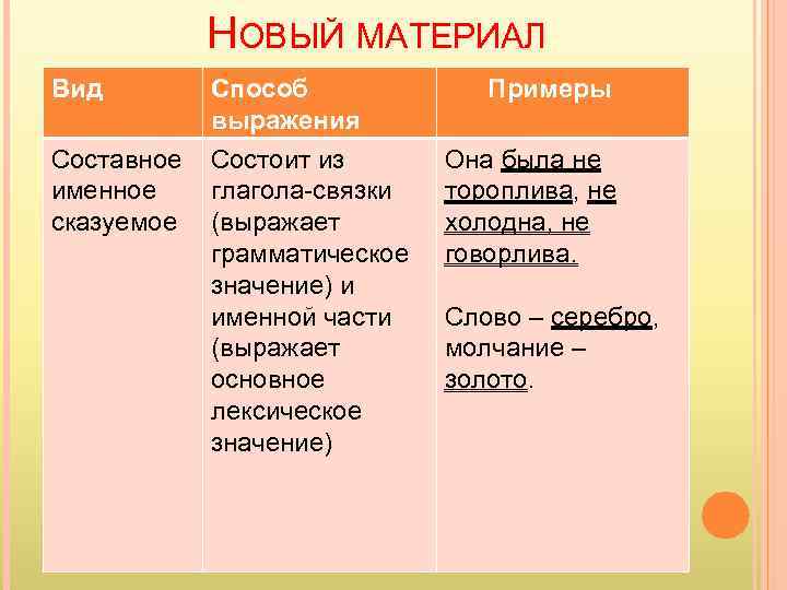 НОВЫЙ МАТЕРИАЛ Вид Составное именное сказуемое Способ выражения Состоит из глагола-связки (выражает грамматическое значение) и именной части (выражает основное лексическое значение) Примеры Она была не тороплива, не холодна, не говорлива. Слово – серебро, молчание – золото.