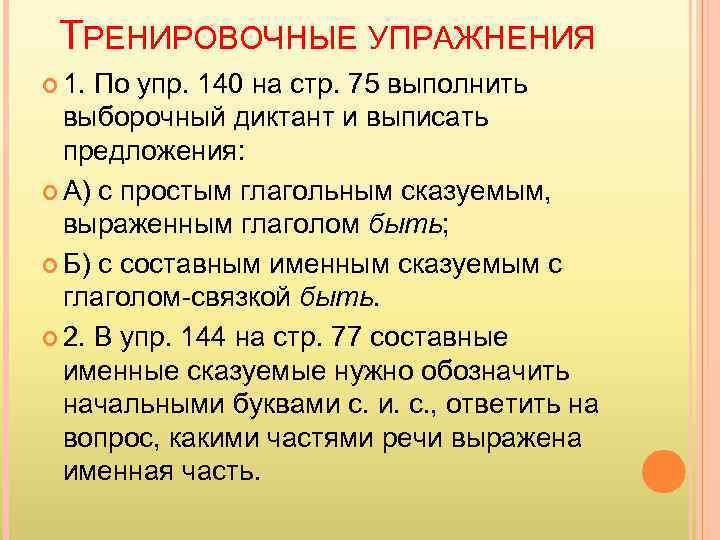 ТРЕНИРОВОЧНЫЕ УПРАЖНЕНИЯ 1. По упр. 140 на стр. 75 выполнить выборочный диктант и выписать предложения: А) с простым глагольным сказуемым, выраженным глаголом быть; Б) с составным именным сказуемым с глаголом-связкой быть. 2. В упр. 144 на стр. 77 составные именные сказуемые нужно обозначить начальными буквами с. и. с. , ответить на вопрос, какими частями речи выражена именная часть.