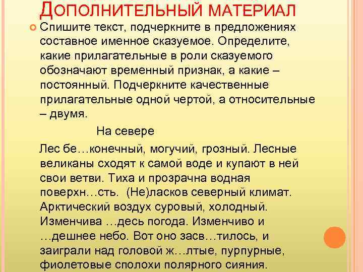 ДОПОЛНИТЕЛЬНЫЙ МАТЕРИАЛ Спишите текст, подчеркните в предложениях составное именное сказуемое. Определите, какие прилагательные в роли сказуемого обозначают временный признак, а какие – постоянный. Подчеркните качественные прилагательные одной чертой, а относительные – двумя. На севере Лес бе…конечный, могучий, грозный. Лесные великаны сходят к самой воде и купают в ней свои ветви. Тиха и прозрачна водная поверхн…сть. (Не)ласков северный климат. Арктический воздух суровый, холодный. Изменчива …десь погода. Изменчиво и …дешнее небо. Вот оно засв…тилось, и заиграли над головой ж…лтые, пурпурные, фиолетовые сполохи полярного сияния.