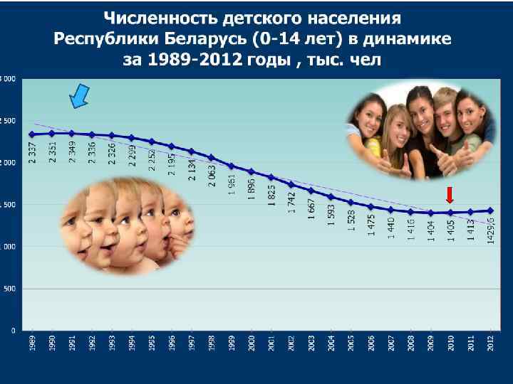 v. Дети в структуре населения Ø в Республике Беларусь из года в год снижается численность детей в общей структуре населения, на сегодняшний день население в возрасте от 0 -14 лет составляет 15, 1% от общей численности населения по сравнению 18, 9% в 2000 году и с 23% в 1989 г. Сокращение доли населения в возрасте до 15 лет в дальнейшем вызовет негативные социально-экономические явления, связанные с неизбежным уменьшением трудовых ресурсов страны, демографическим старением населения повышение государственных расходов на социальное обеспечение приоритета интересов детей является одним из условий устойчивого развития будущего страны