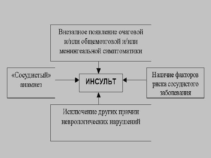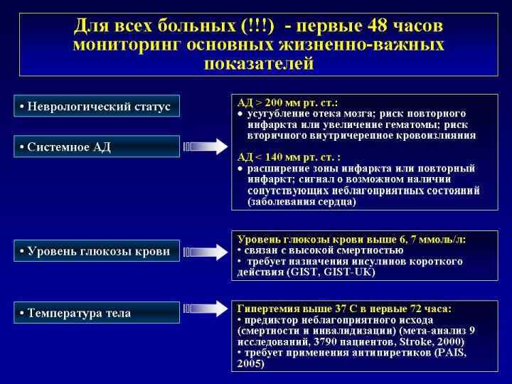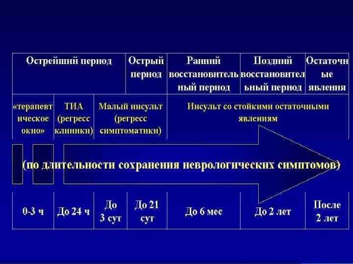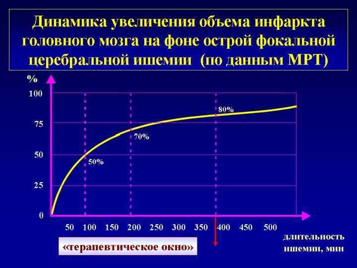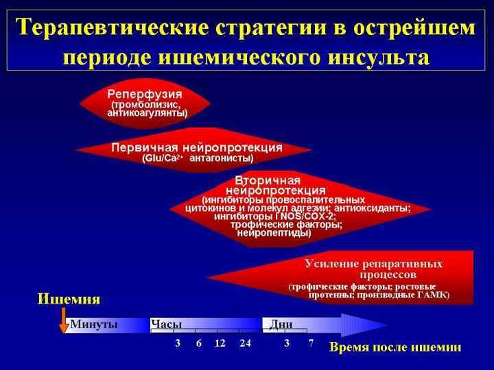 Современная концепция ишемического инсульта неотложное состояние, требующее быстрой и патогенетически обоснованной медицинской помощи; «терапевтическое окно» индивидуальное (первые 180 минут 6 часов); «острейший период» период формирования инфаркта мозга (первые 3 7 дней)