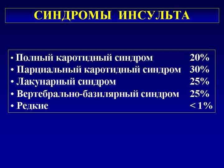 Основные типы инсультов Ишемический инсульт Геморрагический инсульт Внутримозговая гематома ~68 -70% Субарахноидальное кровоизлияние ~28 -30% ~3%