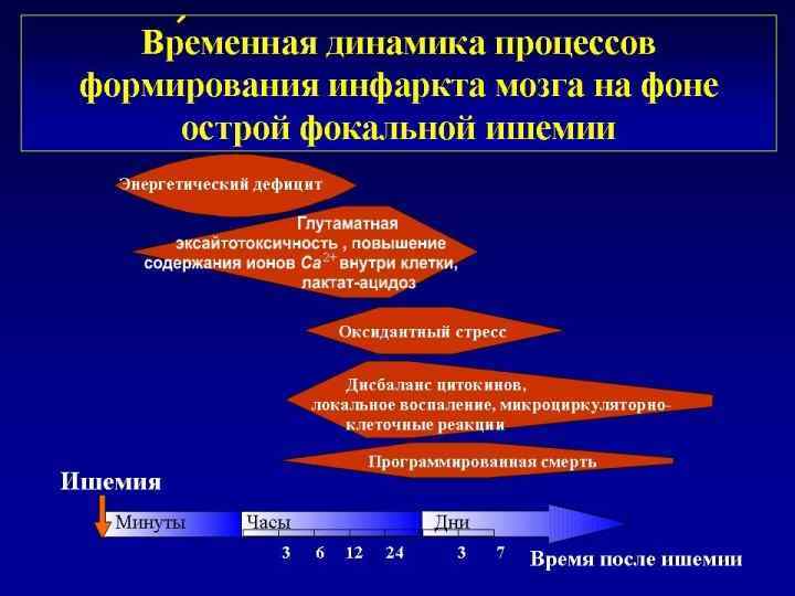 Патофизиологические особенности церебральной ишемии • Формирование инфаркта мозга заканчивается через 3 -6 часов с момента появления первых симптомов. Деформирование очага продолжается до 48 -56 часов. А возможно и дольше.