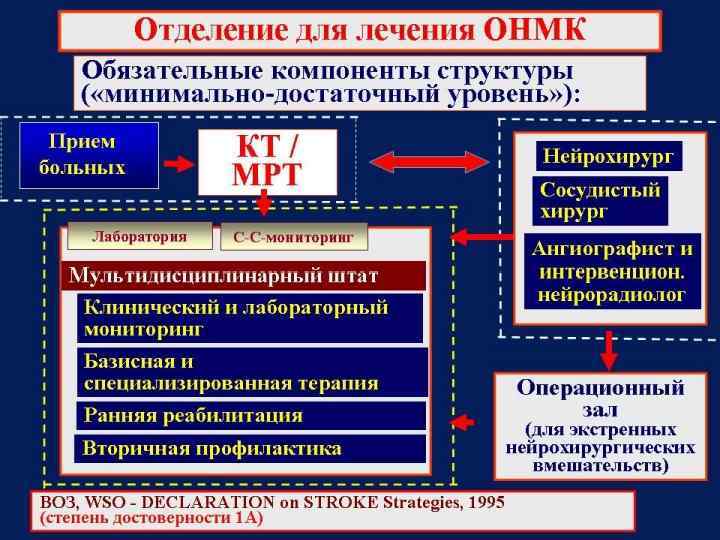 Система оказания помощи больному с инсультом 1. Быстрая диагностика ОНМК 2. Немедленный вызов и госпитализация при помощи СМП 3. Транспортировка с уведомлением принимающей больницы (п/о, БИТ) 4. Приоритет больным с инсультом <3 часов 5. Пациенты с инсультом должны лечиться в инсультных отделениях (уровень I). 6. Пациенты с субарахноидальным кровоизлиянием должны быть госпитализированы в центр с возможностями для нейрохирургического лечения (уровень I). EUSI Recommendations for stroke Management. Cerebrovasc Dis 2003; 16: 311 -337