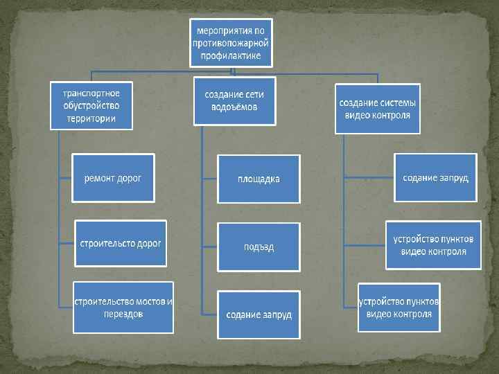 мероприятия по противопожарной профилактике предупреждение возникновения лесных пожаров ограничение распространения лесных пожаров пропаганда обрезка сучьев в молодняках устройство мест отдыха (МАФ) очистка от захламлёности выевление нарушителей и виновников пожара устройство мин. полос шлагбаумы аншлаги стоянки для автомобилей уход за мин. полосами устоойство пртивопожарных разрывов организационно технические мероприятия строительство и ремонт противопожарных объектов создание ПХС