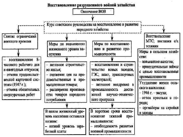 Почему победила идеология коммунистов после ВОВ? • Победа в войне окончательно убедила И. В. Сталина в правильности ранее проводимой политики. К чрезвычайным мерам подталкивала и сложность положения Советского Союза. • Народное хозяйство понесло огромный ущерб в годы войны. • 1946 г. засуха сгубила озимые культуры в ряде районов России, Украины, Молдавии. Разразился голод. • Серьезные проблемы возникли на землях, подвергшихся оккупации. • Достижение второго уровня обороноспособности Советского Союза в условиях «холодной войны» явилось приоритетным направлением.