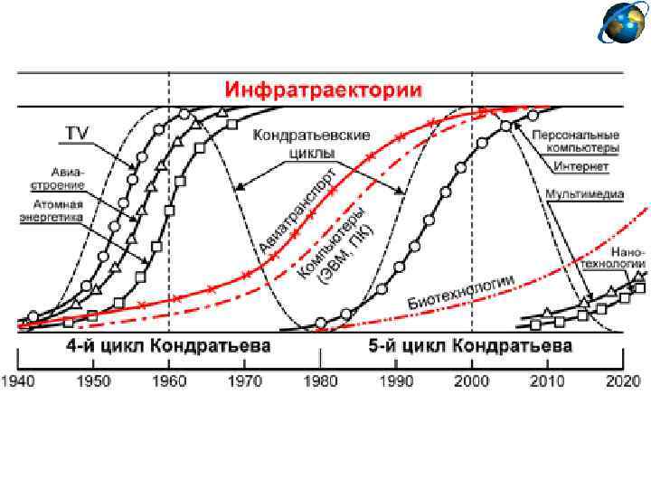«Длинные волны конъюнктуры» Н. Д. Кондратьева (1920 -е) (1) Экономико-технологический анализ Экономическое развитие регионов и мира имеет волнообразный циклический вид этапы подъема и застоя (спада)