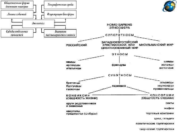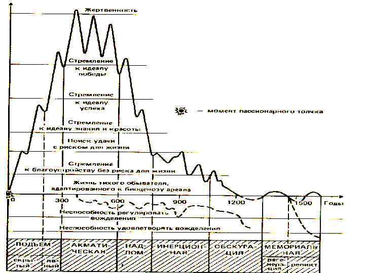 “пассионарные толчки” - синхронные всплески биологической и духовной энергии народов - определили ритмы Евразии Эти толчки - результат “избыточной биохимической энергии биосферы” (возможно, под космическим воздействием) Уровень пассионарности проходит ряд фаз (подъем, акматическая, надлом, инерция, гомеостаз и обскурация), соответствующих историческим этапам развития этноса русские – особый суперэтнос, сложившийся на базе славяно-тюркского синтеза (как исторический альянс Леса и Степи)