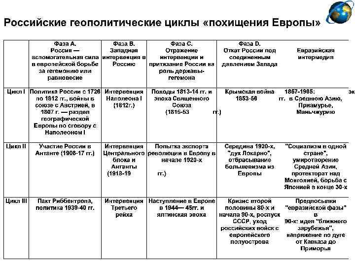 Выделение «этноцивилизационных платформ» на континенте. Российская «платформа» совпадает с границами России XVII века. Она выступает как политический «остров» . Между разными «платформами» существуют территории- «проливы» (бывшая территория СССР, Восточная Европа). Россия за свою историю то включала их в свое тело, то отступала до границ самого «острова» Цикличность развития отношений России и Европы ( «европейских максимумов» и «евразийских интермедий» )