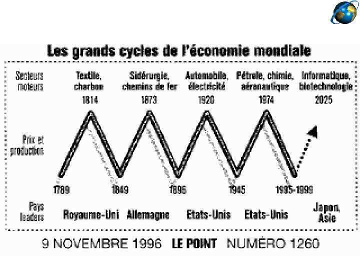 «Длинные волны конъюнктуры» Н. Д. Кондратьева (3) Циклы отчетливо прослеживаются со времени первой промышленной революции. Смена периодов сопровождается НТП, новыми формами организации производства и соответствующими географическими сдвигами. Связь крупных войн и революций с фазами подъема (начало и вершина волны), а фазы застоя - с поляризацией общества, национализмом, ростом таможенных барьеров