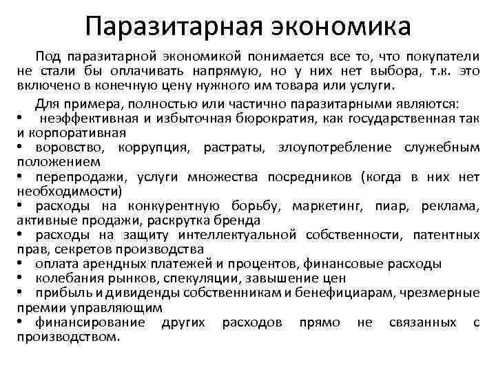 Паразитарная экономика Под паразитарной экономикой понимается все то, что покупатели не стали бы оплачивать напрямую, но у них нет выбора, т. к. это включено в конечную цену нужного им товара или услуги. Для примера, полностью или частично паразитарными являются: • неэффективная и избыточная бюрократия, как государственная так и корпоративная • воровство, коррупция, растраты, злоупотребление служебным положением • перепродажи, услуги множества посредников (когда в них нет необходимости) • расходы на конкурентную борьбу, маркетинг, пиар, реклама, активные продажи, раскрутка бренда • расходы на защиту интеллектуальной собственности, патентных прав, секретов производства • оплата арендных платежей и процентов, финансовые расходы • колебания рынков, спекуляции, завышение цен • прибыль и дивиденды собственникам и бенефициарам, чрезмерные премии управляющим • финансирование других расходов прямо не связанных с производством.