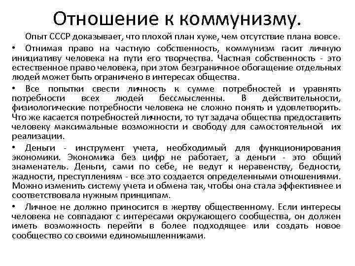 Отношение к коммунизму. Опыт СССР доказывает, что плохой план хуже, чем отсутствие плана вовсе. • Отнимая право на частную собственность, коммунизм гасит личную инициативу человека на пути его творчества. Частная собственность - это естественное право человека, при этом безграничное обогащение отдельных людей может быть ограничено в интересах общества. • Все попытки свести личность к сумме потребностей и уравнять потребности всех людей бессмысленны. В действительности, физиологические потребности человека не сложно понять и удовлетворить. Что же касается потребностей личности, то тут задача общества предоставить человеку максимальные возможности и свободу для самостоятельной их реализации. • Деньги - инструмент учета, необходимый для функционирования экономики. Экономика без цифр не работает, а деньги - это общий знаменатель. Деньги, сами по себе, не ведут к неравенству, бедности, жадности, преступлениям - все это создается определенными отношениями. Можно изменить систему учета и обмена так, чтобы она стала эффективнее и соответствовала нужным принципам. • Личное не должно приносится в жертву общественному. Если интересы человека не совпадают с интересами окружающего сообщества, он должен иметь возможность перейти в более подходящее или создать новое сообщество со своими единомышленниками.