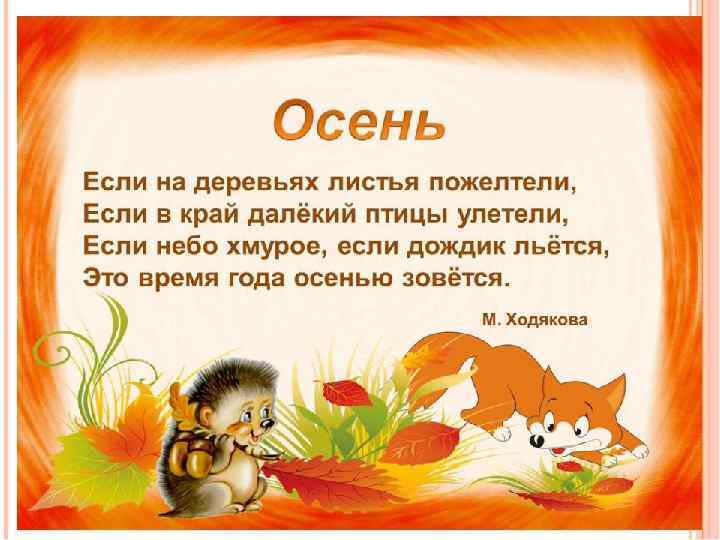 Листья золотые падают, летят, Листья золотые устилают сад. Много на дорожках листьев золотых, Мы букет хороший сделаем из них, Мы букет поставим посреди стола, Осень золотая , как ты нам мила. Е. Благинина