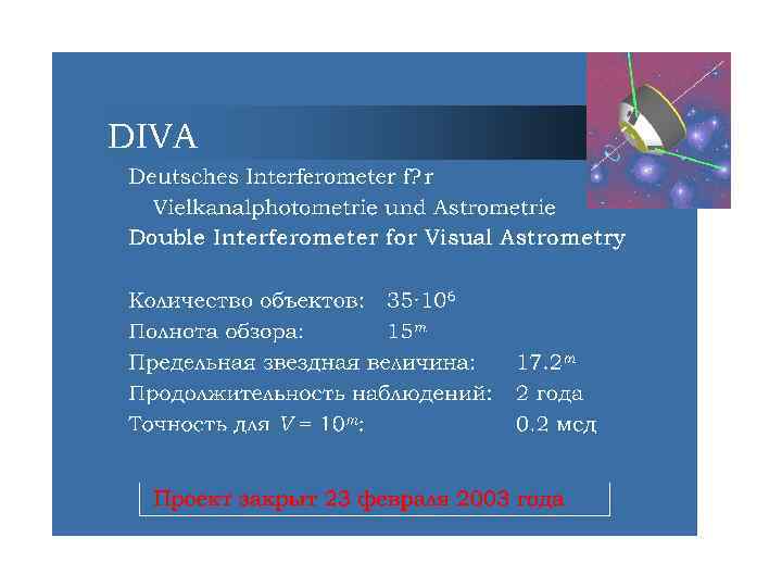 Проекты космической астрометрии • Проекты, не получившие поддержки: Roemer, FAME, SIM DIVA, Ломоносов, Струве, AMEX ЕКА США Гер Россия США • Проекты, получившие поддержку: Gaia (ЕКА), JASMINE (Япония)