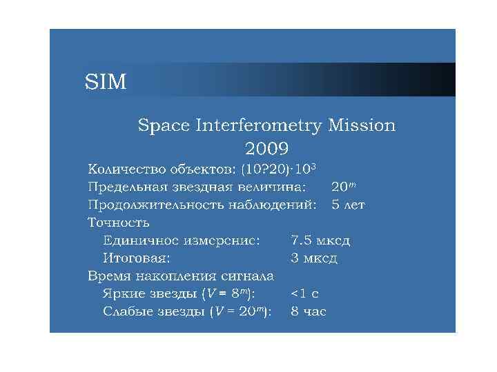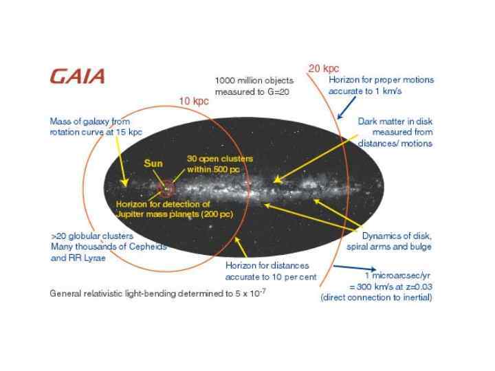 Научные цели проекта Gaia • Картирование Галактики • Физика звезд (классификация, M, L, Ln g, Teff, [Fe/H] ) • Кинематика и динамика Галактики • Космические расстояния (тригонометрически до 10 кпк с 10%, диаграмма Г-Р, цефеиды, RR Lyr) • Возраст Вселенной (расстояния, светимости) • Темная материя (микролинзирование, коричневые карлики) • Фундаментальная система отсчета (квазары, астрометрия) • Планеты (~ MJ, астрометрически и фотометрически) • Фундаментальная физика ( ~ 10 -7 , ~ 10 -5 ) • Солнечная система (массы, орбиты, 5 x 105 тел)
