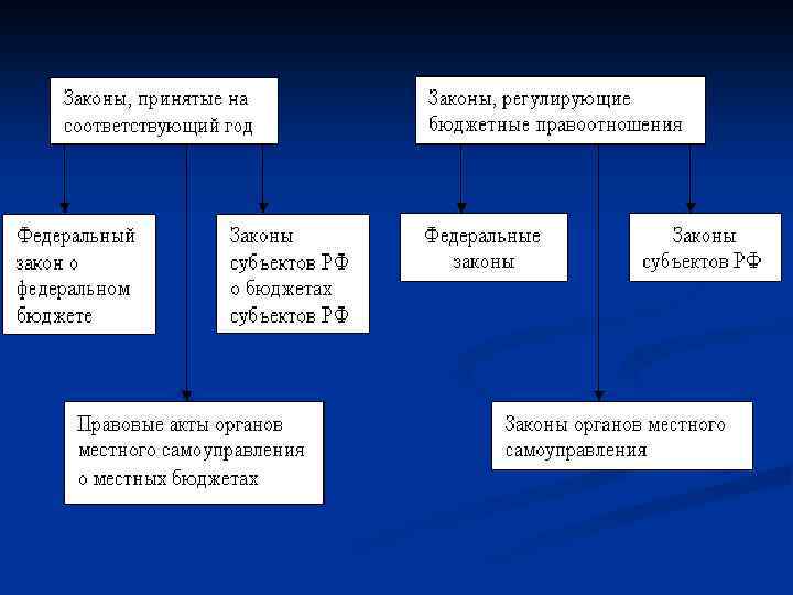 n Государственный бюджет, являясь основным финансовым законом государства, дает органам власти реальную экономическую возможность осуществления властных полномочий. Бюджетное законодательство Российской Федерации состоит из настоящего Кодекса и принятых в соответствии с ним федеральных законов о федеральном бюджете на соответствующий год, законов субъектов Российской Федерации о бюджетах субъектов Российской Федерации на соответствующий год, нормативных правовых актов представительных органов местного самоуправления о местных бюджетах на соответствующий год и иных федеральных законов, законов субъектов Российской Федерации и нормативных правовых актов представительных органов местного самоуправления, регулирующих правоотношения, указанные в статье 1 настоящего Кодекса.