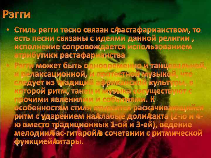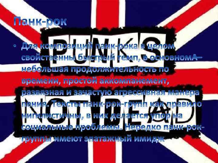 Альтернативный рок • Различные течения в роке, противопоставляющие себя традиционным. В русской музыке наиболее известны следующие группы: Слот, Психея, Animal Джа. Z.