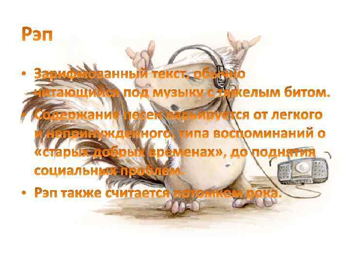 Хип-хоп • Музыкальный жанр, являющийся сочетанием ритмичной музыки и наложенным на неё речитативом, иногда — с наличием мелодичного куплета. Хипхоп музыка является сочетанием двух музыкальных элементов субкультуры хипхопа — диджеинга и эмсиинга • Хип-хоп музыка имеет большое количество направлений