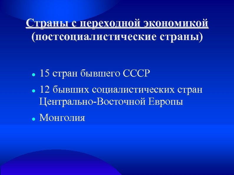 Страны с переходной экономикой (постсоциалистические страны) 15 стран бывшего СССР 12 бывших социалистических стран Центрально-Восточной Европы Монголия
