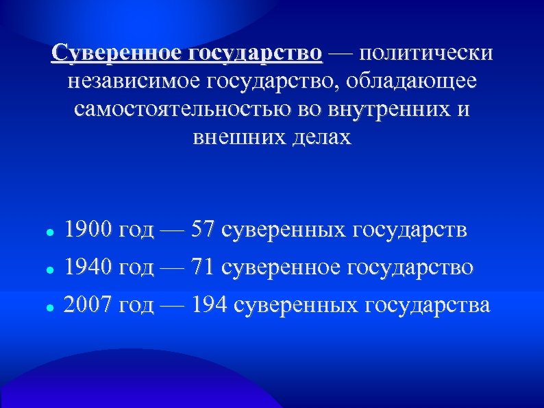 Суверенное государство — политически независимое государство, обладающее самостоятельностью во внутренних и внешних делах 1900 год — 57 суверенных государств 1940 год — 71 суверенное государство 2007 год — 194 суверенных государства