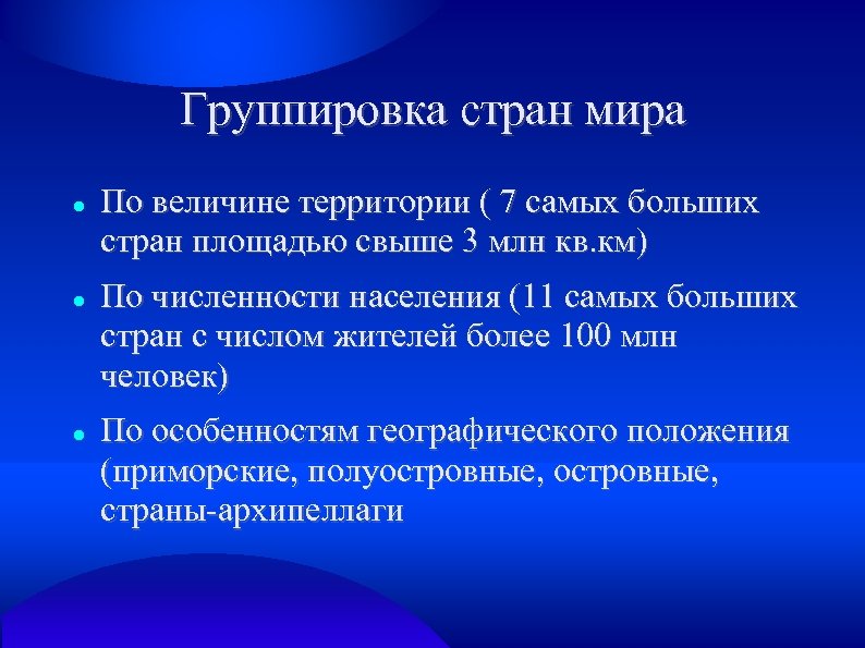 Группировка стран мира По величине территории ( 7 самых больших стран площадью свыше 3 млн кв. км) По численности населения (11 самых больших стран с числом жителей более 100 млн человек) По особенностям географического положения (приморские, полуостровные, страны-архипеллаги