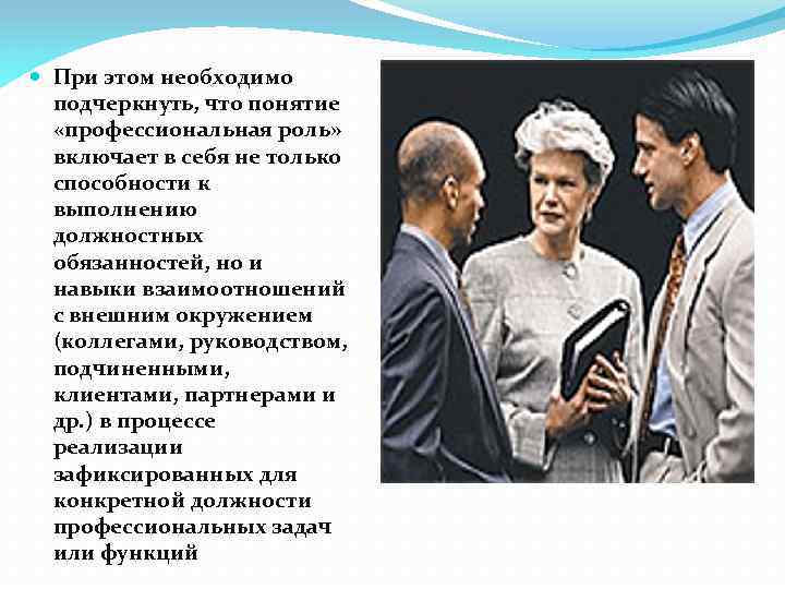 При этом необходимо подчеркнуть, что понятие «профессиональная роль» включает в себя не только способности к выполнению должностных обязанностей, но и навыки взаимоотношений с внешним окружением (коллегами, руководством, подчиненными, клиентами, партнерами и др. ) в процессе реализации зафиксированных для конкретной должности профессиональных задач или функций