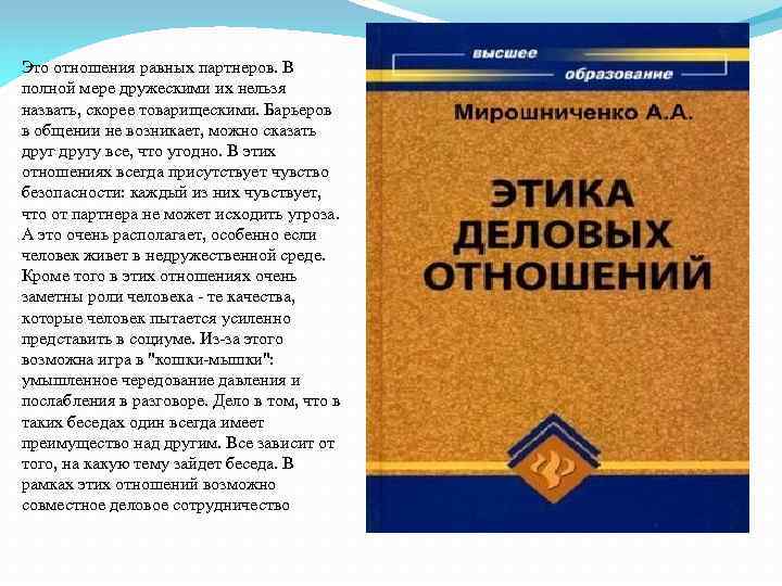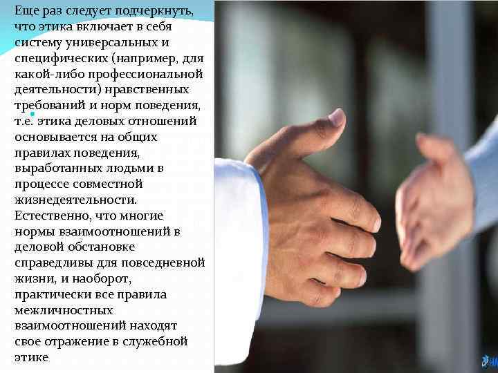 Еще раз следует подчеркнуть, что этика включает в себя систему универсальных и специфических (например, для какой либо профессиональной деятельности) нравственных требований и норм поведения, Еще раз следует подчеркнуть, что этика включает в себя систему т. е. этика деловых отношений универсальных и специфических (например, для какой-либо основывается на общих профессиональной деятельности) нравственных требований и норм правилах поведения, т. е. этика деловых отношений основывается на общих правилах поведения, выработанных людьми в процессе совместной выработанных людьми в жизнедеятельности. Естественно, что многие нормы взаимоотношений в процессе совместной деловой обстановке справедливы для повседневной жизни, и наоборот, жизнедеятельности. практически все правила межличностных взаимоотношений находят свое Естественно, что многие отражение в служебной этике нормы взаимоотношений в деловой обстановке справедливы для повседневной жизни, и наоборот, практически все правила межличностных взаимоотношений находят свое отражение в служебной этике