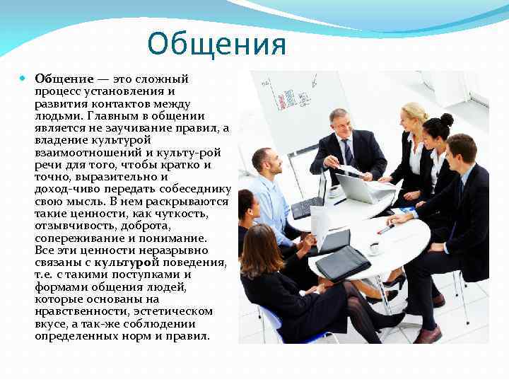 Общения Общение — это сложный процесс установления и развития контактов между людьми. Главным в общении является не заучивание правил, а владение культурой взаимоотношений и культу рой речи для того, чтобы кратко и точно, выразительно и доход чиво передать собеседнику свою мысль. В нем раскрываются такие ценности, как чуткость, отзывчивость, доброта, сопереживание и понимание. Все эти ценности неразрывно связаны с культурой поведения, т. е. с такими поступками и формами общения людей, которые основаны на нравственности, эстетическом вкусе, а так же соблюдении определенных норм и правил.