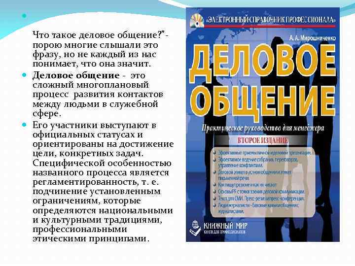 Что такое деловое общение? " порою многие слышали это фразу, но не каждый из нас понимает, что она значит. Деловое общение это сложный многоплановый процесс развития контактов между людьми в служебной сфере. Его участники выступают в официальных статусах и ориентированы на достижение цели, конкретных задач. Специфической особенностью названного процесса является регламентированность, т. е. подчинение установленным ограничениям, которые определяются национальными и культурными традициями, профессиональными этическими принципами.