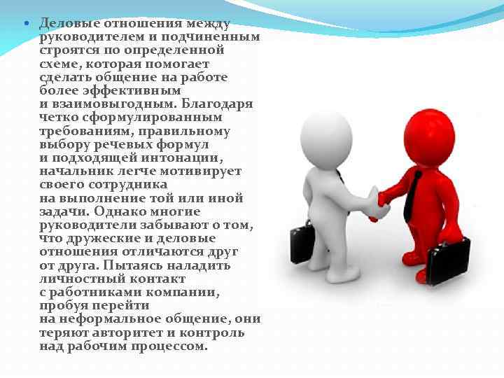 Деловые отношения между руководителем и подчиненным строятся по определенной схеме, которая помогает сделать общение на работе более эффективным и взаимовыгодным. Благодаря четко сформулированным требованиям, правильному выбору речевых формул и подходящей интонации, начальник легче мотивирует своего сотрудника на выполнение той или иной задачи. Однако многие руководители забывают о том, что дружеские и деловые отношения отличаются друг от друга. Пытаясь наладить личностный контакт с работниками компании, пробуя перейти на неформальное общение, они теряют авторитет и контроль над рабочим процессом.