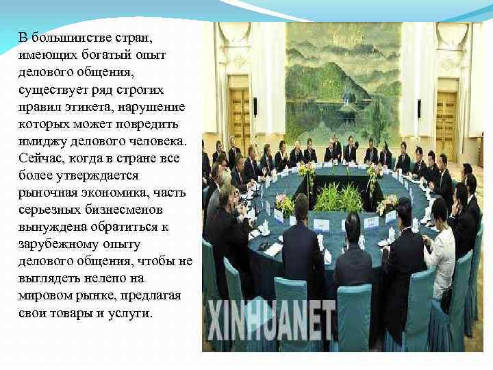 В большинстве стран, имеющих богатый опыт делового общения, существует ряд строгих правил этикета, нарушение которых может повредить имиджу делового человека. Сейчас, когда в стране все более утверждается рыночная экономика, часть серьезных бизнесменов вынуждена обратиться к зарубежному опыту делового общения, чтобы не выглядеть нелепо на мировом рынке, предлагая свои товары и услуги.