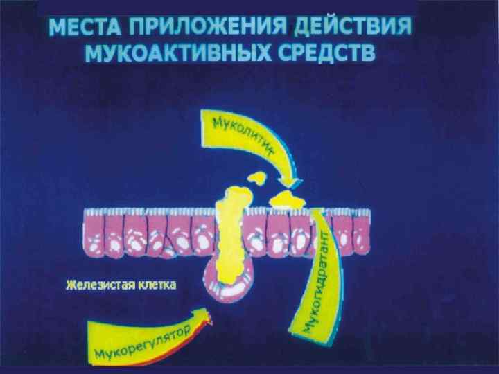Лекарственные средства, улучшающие откашливание мокроты 1. Средства, стимулирующие отхаркивание: - Рефлекторно действующие препараты (термопсис, алтей, солодка, эфирные масла , гвайфенезин) - Препараты резорбтивного действия (натрия и калия иодид, аммония хлорид, натрия гидрокарбонат) 2. Муколитические (секретолитические) препараты (бромгексин, амброксол, ацетилцистеин, месна, протеолитические ферменты, дорназе )