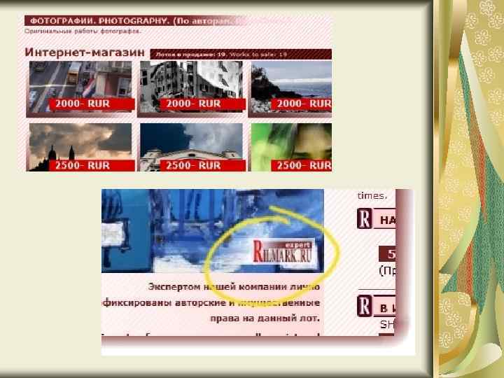 Аукционный дом «Рилмарк» Специализируется на продаже предметов искусства; Интернет-магазин или аукционный торг; Работы современных авторов: живопись, фотография, керамика, авторская мебель, аксессуары, музыка, постеры, репродукции и другое. Ознакомиться с работами можно на официальном сайте: работы, выставленнные на аукционный торг и те работы, которые пока не продаются; Экспертный отбор каждого экземпляра; Связь через аукционный дом с владельцами лотов; Видео-просмотры лотов, осмотр в офисе; Рилмарк – агент по поиску и подбору произведений искусства; Защита авторских прав.