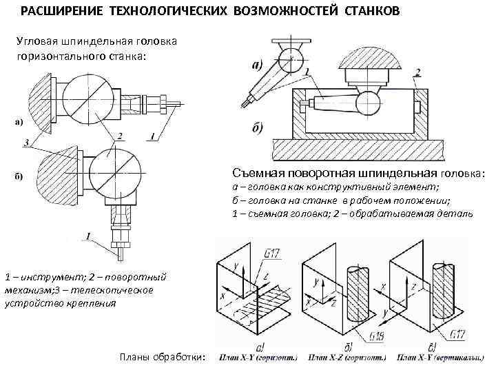 РАСШИРЕНИЕ ТЕХНОЛОГИЧЕСКИХ ВОЗМОЖНОСТЕЙ СТАНКОВ Угловая шпиндельная головка горизонтального станка: Съемная поворотная шпиндельная головка: а – головка как конструктивный элемент; б – головка на станке в рабочем положении; 1 – съемная головка; 2 – обрабатываемая деталь 1 – инструмент; 2 – поворотный механизм; 3 – телескопическое устройство крепления Планы обработки: