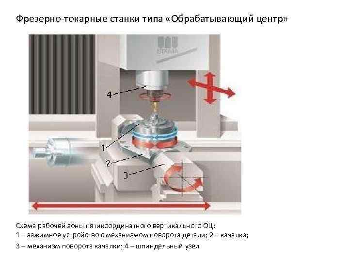 Фрезерно-токарные станки типа «Обрабатывающий центр» Схема рабочей зоны пятикоординатного вертикального ОЦ: 1 – зажимное устройство с механизмом поворота детали; 2 – качалка; 3 – механизм поворота качалки; 4 – шпиндельный узел