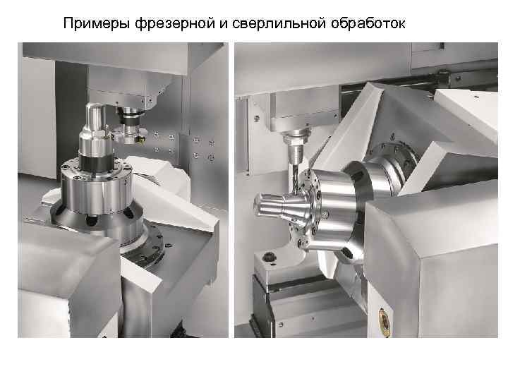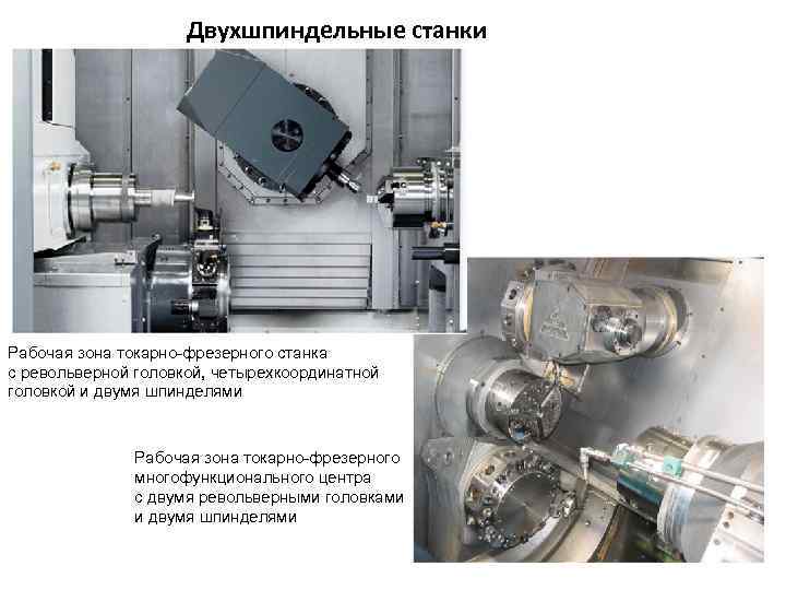 Двухшпиндельные станки Рабочая зона токарно-фрезерного станка с револьверной головкой, четырехкоординатной головкой и двумя шпинделями Рабочая зона токарно-фрезерного многофункционального центра с двумя револьверными головками и двумя шпинделями