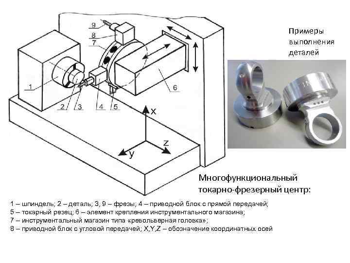 Примеры выполнения деталей Многофункциональный токарно-фрезерный центр: 1 – шпиндель; 2 – деталь; 3, 9 – фрезы; 4 – приводной блок с прямой передачей; 5 – токарный резец; 6 – элемент крепления инструментального магазина; 7 – инструментальный магазин типа «револьверная головка» ; 8 – приводной блок с угловой передачей; X, Y, Z – обозначение координатных осей