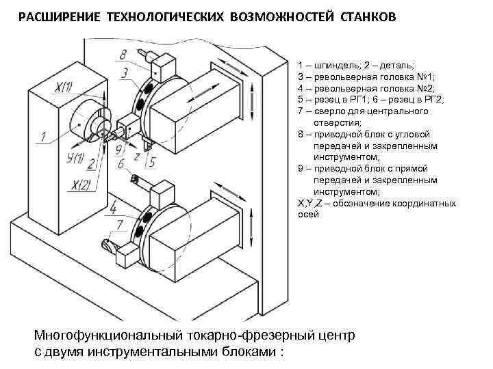РАСШИРЕНИЕ ТЕХНОЛОГИЧЕСКИХ ВОЗМОЖНОСТЕЙ СТАНКОВ 1 – шпиндель; 2 – деталь; 3 – револьверная головка № 1; 4 – револьверная головка № 2; 5 – резец в РГ 1; 6 – резец в РГ 2; 7 – сверло для центрального отверстия; 8 – приводной блок с угловой передачей и закрепленным инструментом; 9 – приводной блок с прямой передачей и закрепленным инструментом; X, Y, Z – обозначение координатных осей Многофункциональный токарно-фрезерный центр с двумя инструментальными блоками :