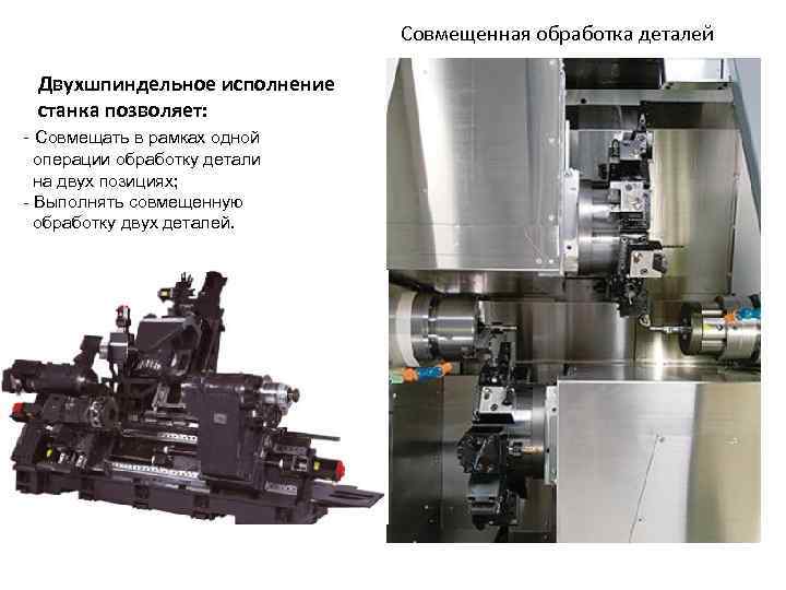 Совмещенная обработка деталей Двухшпиндельное исполнение станка позволяет: - Совмещать в рамках одной операции обработку детали на двух позициях; - Выполнять совмещенную обработку двух деталей.