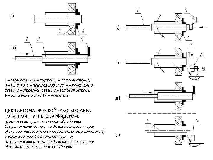а) в) б) г) 1 – толкатель; 2 – пруток; 3 – патрон станка; 4 – кулачки; 5 – приходящий упор; 6 – контурный резец; 7 – отрезной резец; 8 – готовая деталь; 9 – остаток прутка; 10 – ловитель; д) ЦИКЛ АВТОМАТИЧЕСКОЙ РАБОТЫ СТАНКА ТОКАРНОЙ ГРУППЫ С БАРФИДЕРОМ: а) установка прутка в начале обработки; б) проталкивание прутка до приходящего упора; в) обработка заготовки очередным инструментом; г) отрезка готовой детали от прутка; д) проталкивание прутка до приходящего упора; е) выемка прутка в конце обработки е)